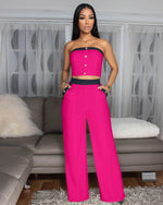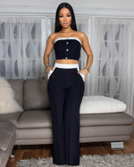 Make a statement with the Boss Babe Set, designed for bold women who love sleek, modern style. This eye-catching set features a strapless crop top with gold button details and contrasting trim, paired with high-waisted wide-leg pants that elongate your silhouette. Crafted from smooth, structured fabric, it offers a polished and flattering fit perfect for parties, nights out, or upscale casual occasions.