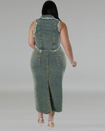 Make a bold statement with this trendy plus size denim two-piece set! Featuring a sleeveless vest with eye-catching frayed edges and a high-waisted midi skirt with a front slit, this set is perfect for confident curves and effortless style. The vintage-washed denim, structured silhouette, and fashionable details create an edgy yet feminine look, ideal for casual outings or dressed-up events.