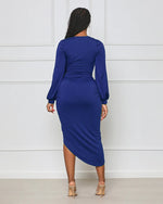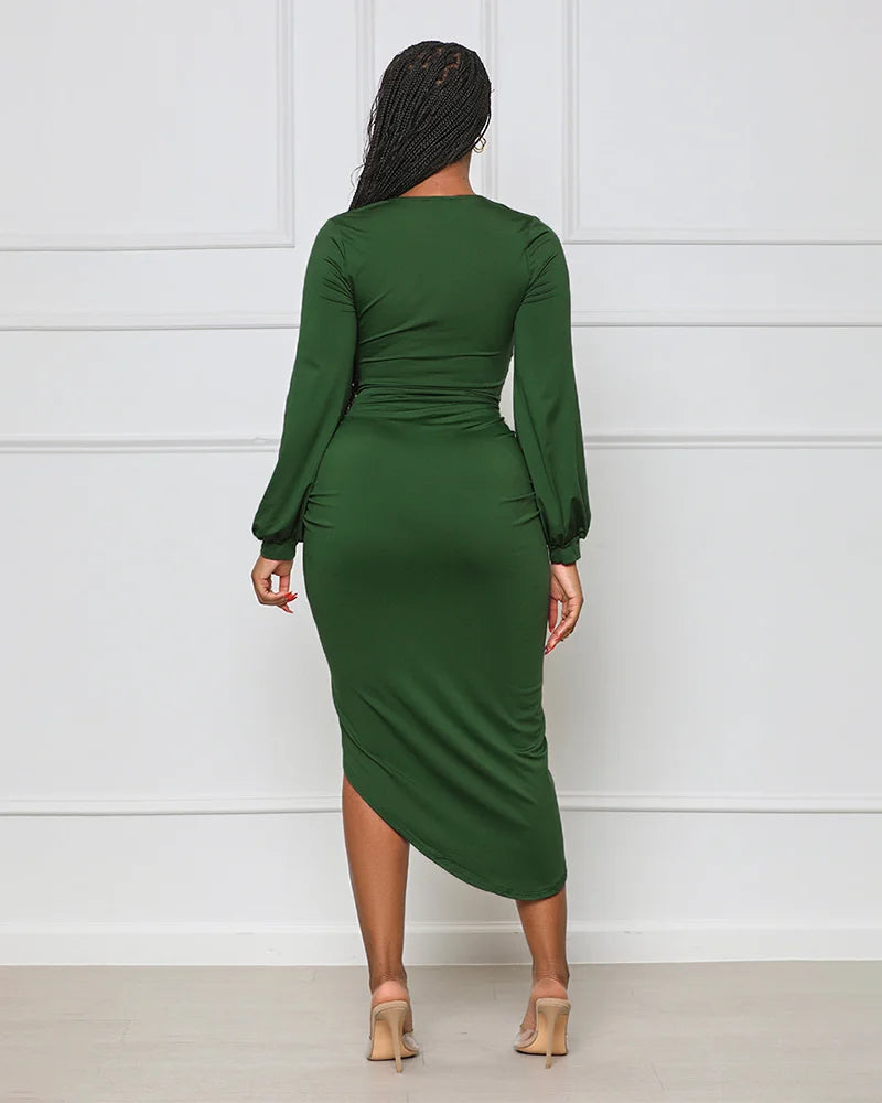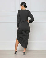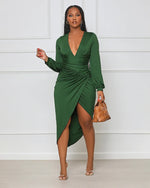 This elegant midi dress features a flattering ruched design and a deep V-neckline for a sophisticated silhouette. With long bishop sleeves and an asymmetrical hemline slit, it’s perfect for evening events or a stylish night out.