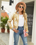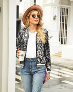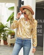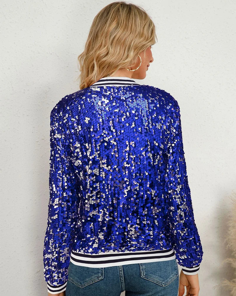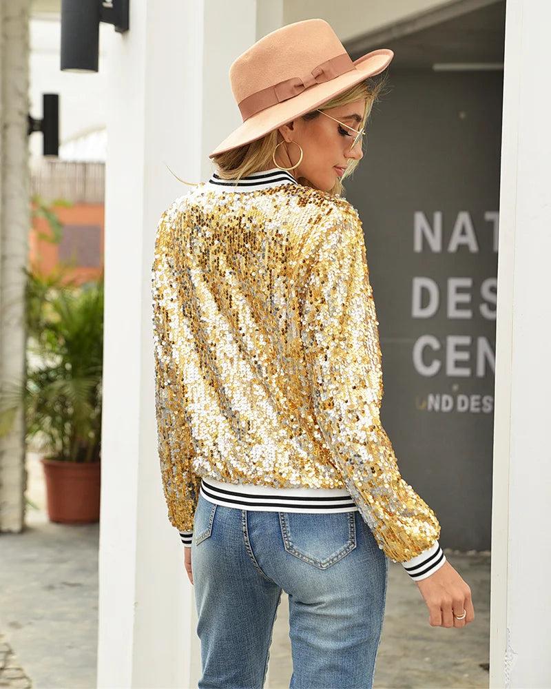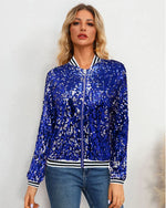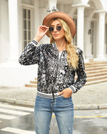 Step into the spotlight with the Glimmer Groove Sequin Bomber Jacket. Covered in shimmering sequins, this jacket adds bold sparkle to any outfit while offering a comfortable, lightweight fit. Featuring a classic bomber silhouette with ribbed cuffs, collar, and hem, it pairs effortlessly with jeans or dresses for a stylish, party-ready look. Perfect for nights out, special events, or anytime you want to shine with confidence.