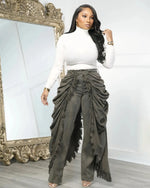 Bold texture meets sculpted attitude — the Draped in Denim Jeans are made to stand out. Featuring dramatic ruched draping with raw fringe edges, this high-waist design brings runway energy to streetwear. Structured denim shapes the legs while the layered panels add movement, making every step a statement.
