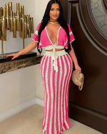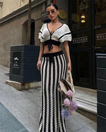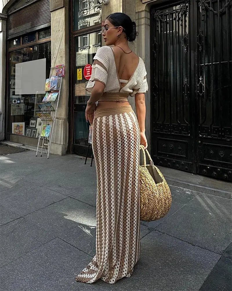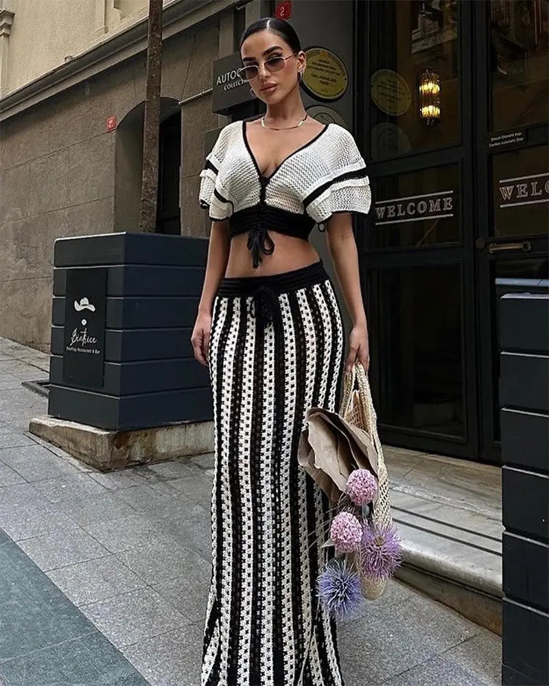 Elevate your wardrobe with this Vintage Elegance Knit Set, featuring a stylish cropped cardigan and a matching high-waisted maxi skirt. The cardigan showcases a flattering V-neckline with a delicate drawstring tie and unique layered short sleeves, blending femininity with a modern twist. The coordinating maxi skirt offers a comfortable, relaxed fit with vertical stripes that elongate your silhouette for a graceful look.