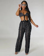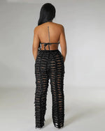 Make a bold fashion statement with our Distressed Mesh Pants, designed to turn heads with their daring ripped texture and breathable sheer fabric. The elastic waistband ensures a comfortable and flattering fit, while the unique distressed design adds an edgy vibe to your look. Perfect for layering or standing out on its own, these pants bring style and comfort together effortlessly.