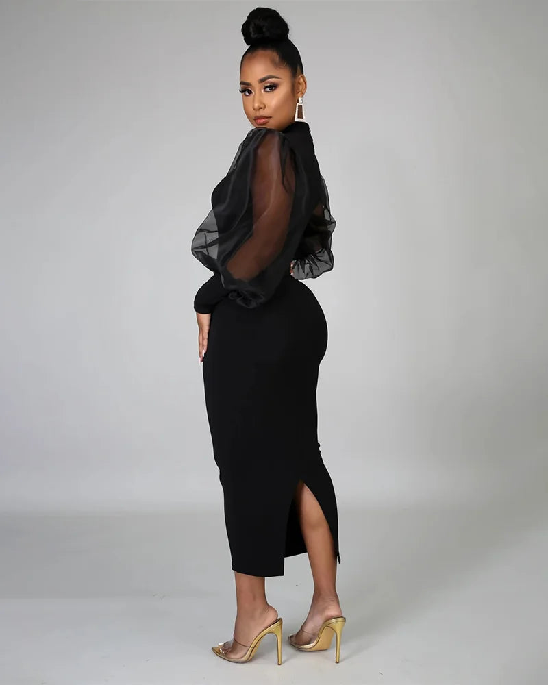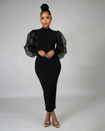 Own the night with the Sheer Allure Mesh Sleeve Midi Dress—a striking blend of sophistication and modern drama. This sleek bodycon silhouette features sheer organza puff sleeves that command attention, while the figure-hugging design celebrates your curves. Effortlessly elegant, it’s the perfect statement piece for cocktail parties, dinner dates, or any occasion that calls for bold, confident style.