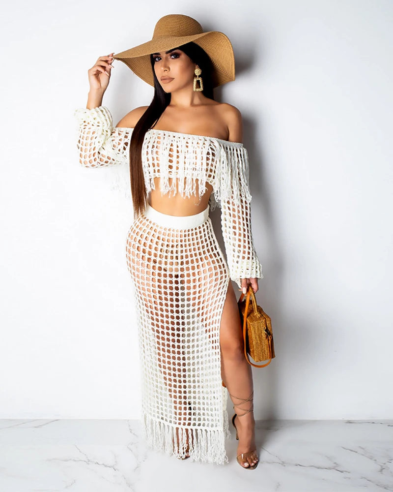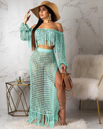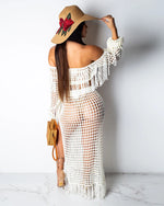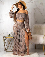 Turn every stroll into a runway moment with this stunning crochet two-piece set. Featuring an off-shoulder crop top with playful fringe and a high-slit maxi skirt, this breezy look is perfect for seaside escapes, summer parties, and unforgettable getaways.